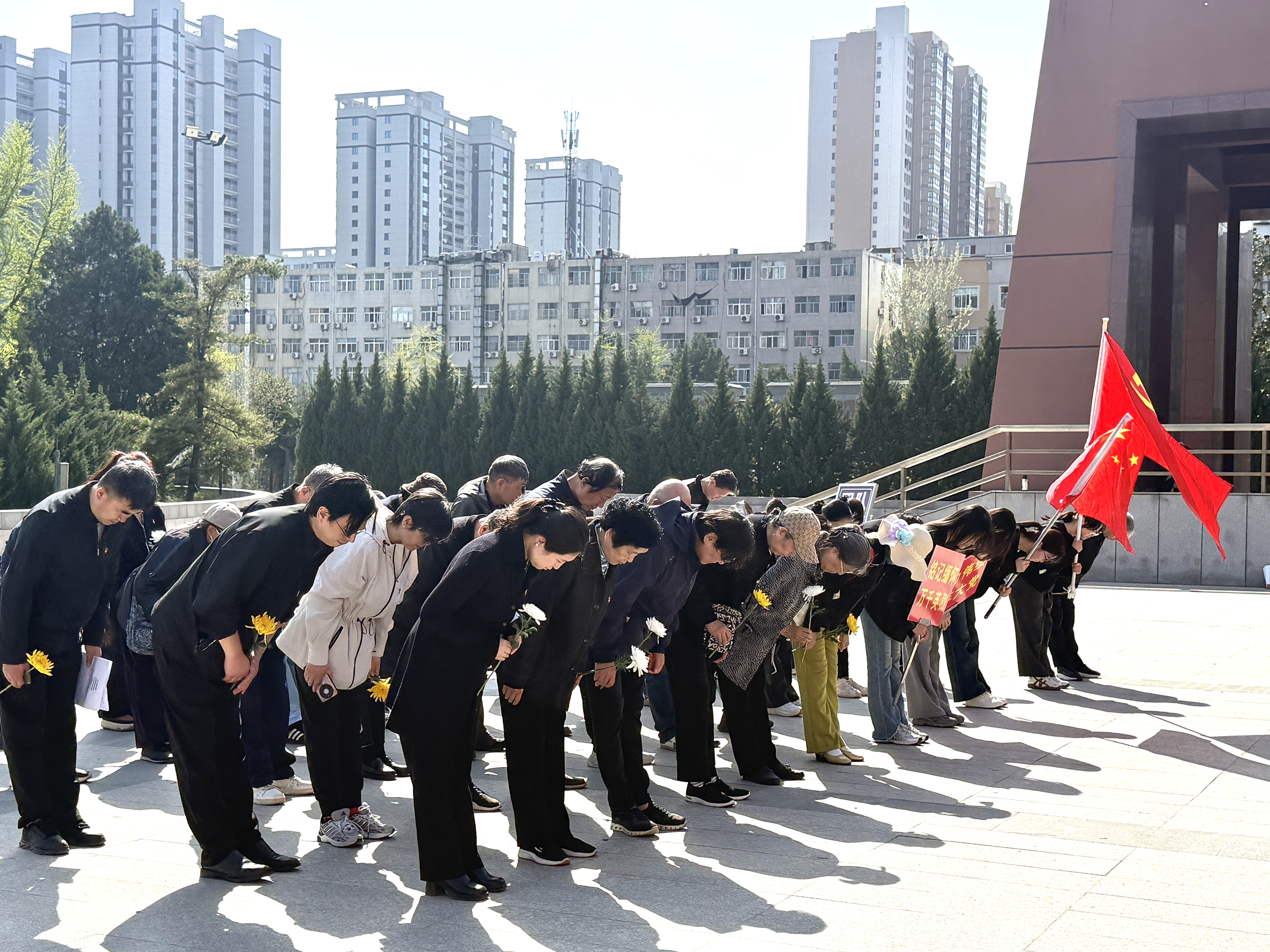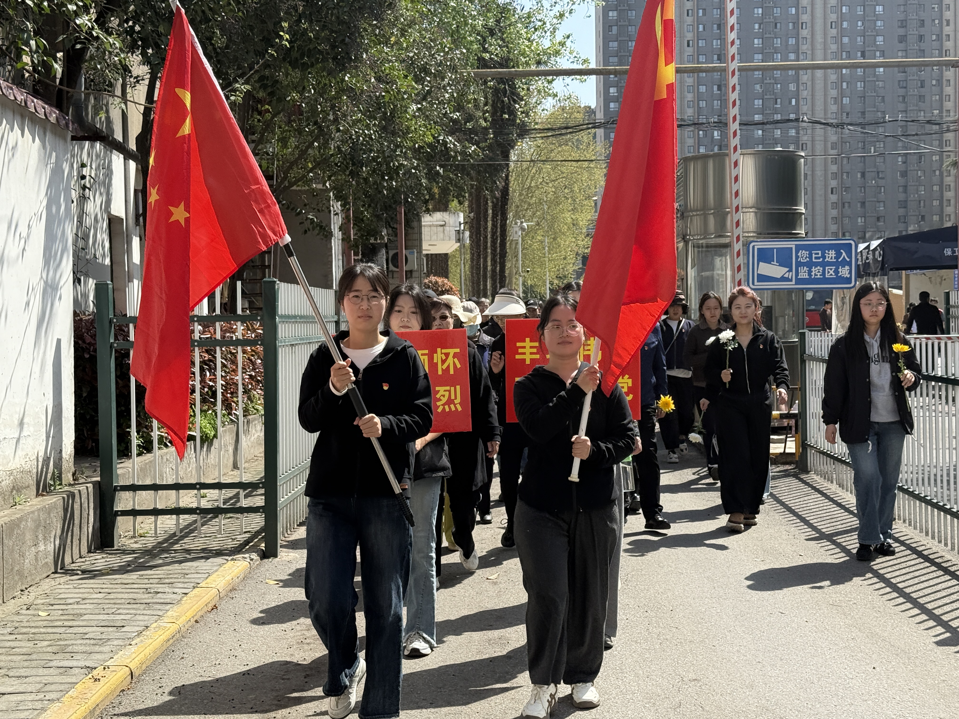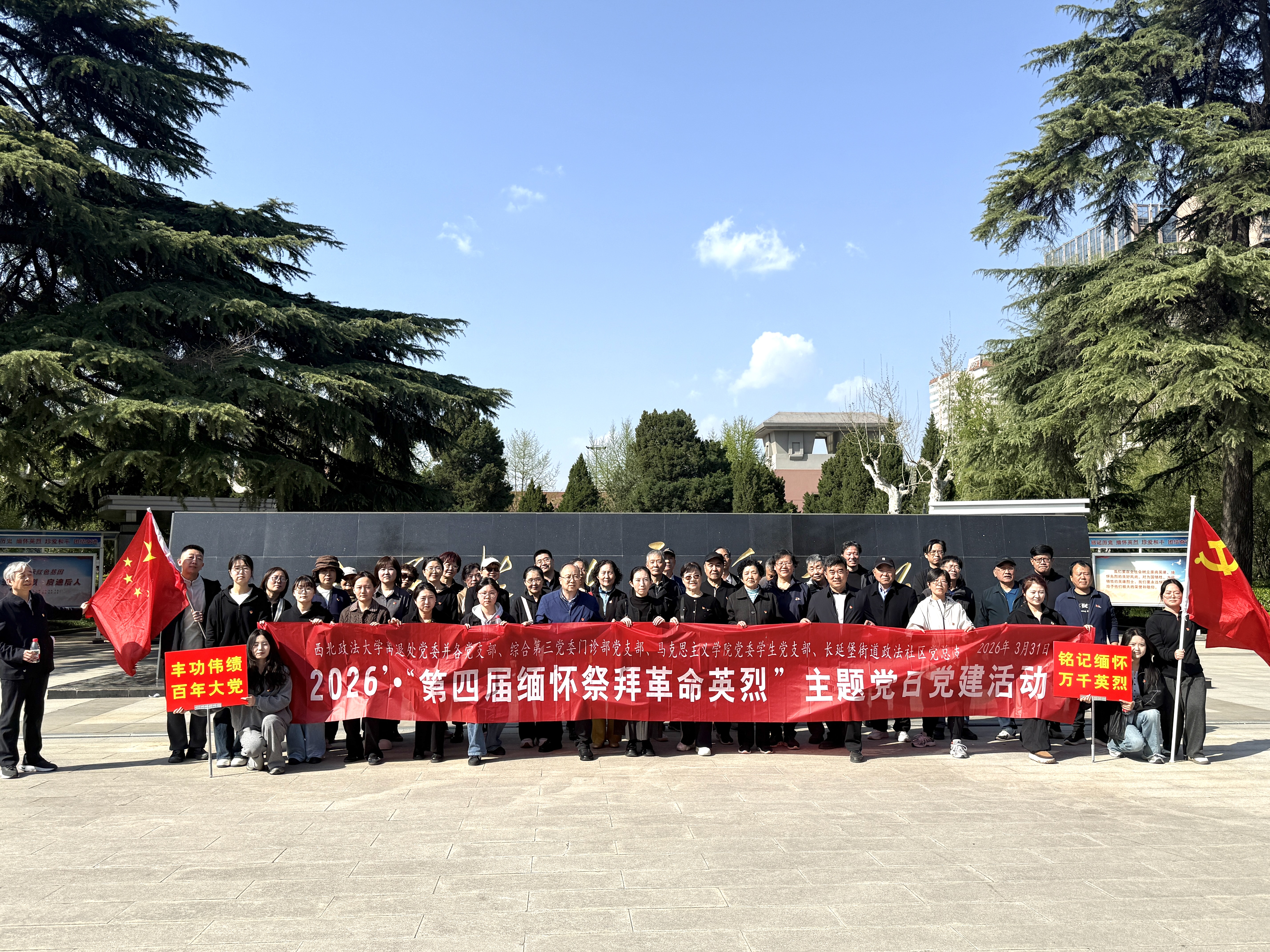 3月31日,离退处党委及各党支部联合学校综合第三党委门诊部党支部、马克思主义学院党委学生党支部、雁塔区长延堡街道西北政法大学社区党总支各党支部共同开展第四届“丰功伟绩百年大党 铭记缅怀万千英烈”主题党日活动。4个二级基层党组织、近20个党支部的50余名老中青三代党员及部分共青团员、非党退休教职工,从雁塔校区北门出发,在党旗、国旗引领下,手持鲜花徒步前往西安烈士陵园,缅怀革命英烈、传承红色精神。