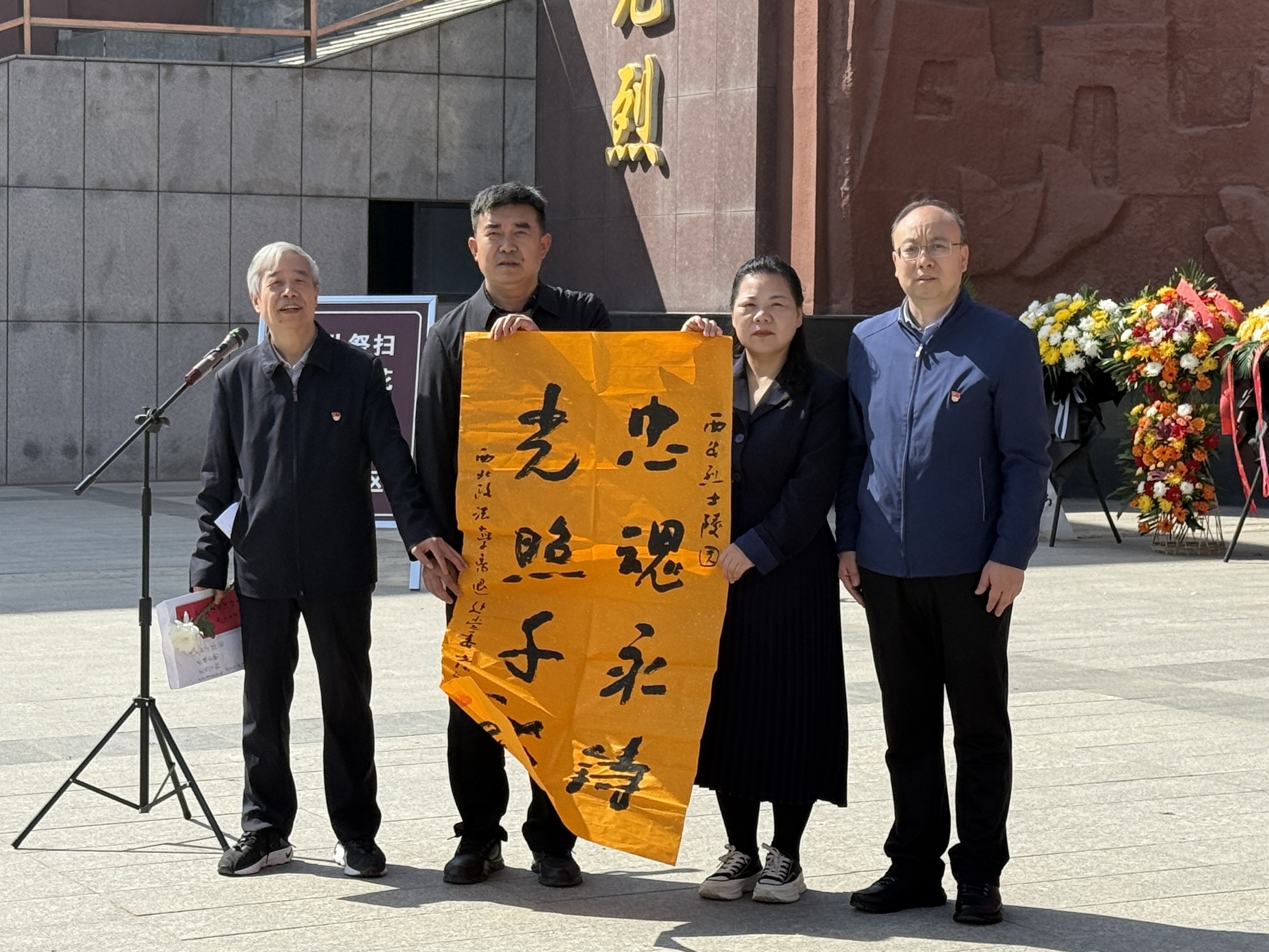 综合第三党委门诊部党支部书记、门诊部主任,雁塔区长延堡街道西北政法大学社区党总支书记、社区主任金山主持活动。离退处党委副书记、副处长王云代表学校,向我校爱国主义教育基地——西安烈士陵园,赠送民商法学院董少谋教授创作的“忠魂永铸 光照千秋”书法作品,西安烈士陵园褒扬科科长耶娟妮代为接收。党员师生向英烈敬献花篮,全体人员肃立三鞠躬,4名党员代表代表全体人员向英烈致敬告白,参与人员依次敬献鲜花,祈愿英烈英名永垂、忠魂永驻。在英烈墓园区,大家向我校前身西北人民革命大学校长李敷仁烈士及其他革命英烈鞠躬献花,缅怀其不朽功绩。在英烈英名纪念墙前,党员、教职工手持抹布,细心为英烈英名除尘清洁,以实际行动守护英烈荣光,部分人员还向纪念墙敬献鲜花寄托哀思。