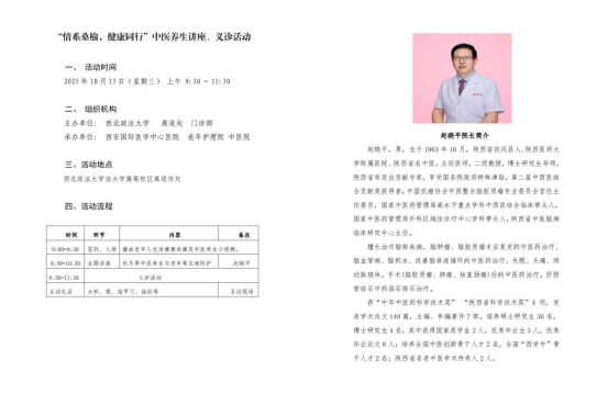 为普及健康知识,提升离退休教职工健康意识,离退处联门诊部邀请西安国际医学中心医院老年护理院专家来校开展主题讲座和义诊活动,请各位老师积极参与。现场互动环节有水杯、笔、指甲刀、抽纸等礼品。